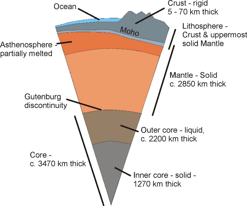 The mantle lies below the crust and is up to 2900 km thick.  It consists of hot, dense, iron and magnesium-rich solid rock. The crust and the upper part of the mantle make up the lithosphere, which is broken into plates, both large and small. To learn more about these plates see the Plate Tectonics page​.