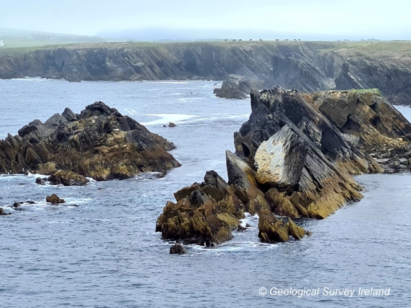 Cloichear – Clogher – Corca Dhuibhne, Co Ciarraí. Moderately dipping beds of volcanics and siltstone laid down in the middle Silurian Period (433 – 427 Ma).