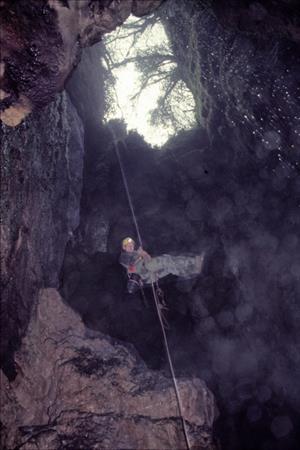 B) This shows the same collapse feature with a caver going down the ladder inside. Note the void and the neck of subsoil material about half way down.