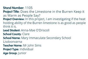 The annual BT Young Scientist and Technology Exhibition was once again online for 2022. Koen Verbruggen, Geological Survey Ireland's Director, presented the Geological Survey Ireland award to Anna-Mae O'Driscoll for her project "Does the Limestone in the Burren Keep it as Warm as People Say?". Anna-Mae, from Mary Immaculate Secondary School (Lisdoonvarna, Co. Clare), investigated the heat holding ability of the Burren limestone. She was also awarded third place in the Chemical, Physical and Mathematical Junior Individual Category.